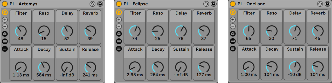 Each preset has 8 macros control (filter, resonance, delay, reverb, attack, decay, sustain, release) to achieve quickly the exact sound you need for your track.